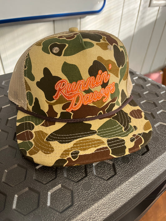Runnin' Dawgs Hat with Mesh Back, Flat Bill, Duck Camo with Rope