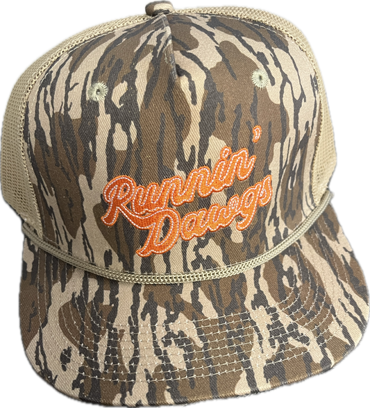 Runnin' Dawgs Hat with Mesh Back, Flat Bill, Timber Camo with Rope